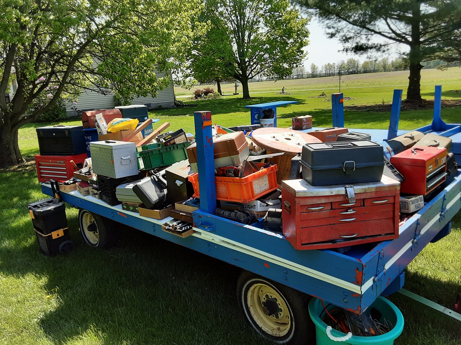 Collectibles/Household: pressed oak cabinets; wd. craft wall cabinets; oak table w/ 2 chairs; wine rack; Coleman lantern & stove; southwestern pictures & frames; pot belly stove; gun rack; flat screen TV; childs drop leaf table w/ (2) chairs; Sony 5 disc changer; Audiovox monitor cassette player; lamps; fireplace set; cassette tapes & CD’s; arm chair; kidney vanity; (2) & (4) drawer file cabinets; lawn & camping chairs; family size 12v cooler/warmer; coolers; stereo system; Zenith TV; Meade telescope; TV trays; totes; fans; sleds; baseball cards; assort. bicycles; Coleman lights & camp stove; holiday décor; TOOLS: Craftsman: tools box btm. caddies, top toolboxes & hand types; ¼” & ½” socket sets; shop vac; wrenches; hand powered tools; organizers; hardware supplies; digital caliper; air hose; several portable air compressors; grease guns; hand carts; wd. block planes; wheelbarrows; log chains (LD); Rubbermaid cabinet; pry bars; punches; bench vices; B & D workmates; part. roll rebar; wd. & alum. step ladders; floor & bottle jacks; car ramps; ext. cords; jack stands; multipurpose jack stand 500# cap.; drill bits; deep well sockets; Quaker State & Citgo cases of oil; 10” bandsaw- table mod.; air tank; H & G tools; power washer; metal cabinets; PT wagon seat; Sears battery charger; Gorilla cart (child’s wagon); hose clamps; mag-lights; Pittsburg & Kobalt tool sets; ventless heaters; Reddy space heater; AMMO: Remington & Winchester 12GA.; 6.35mm; Winchester 25 ammo; 25 automatic UMC- misc./etc.