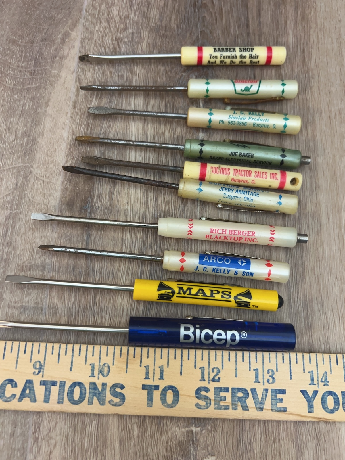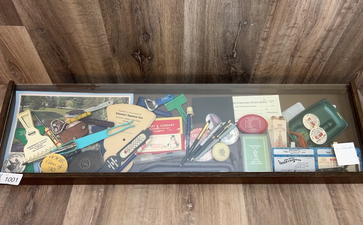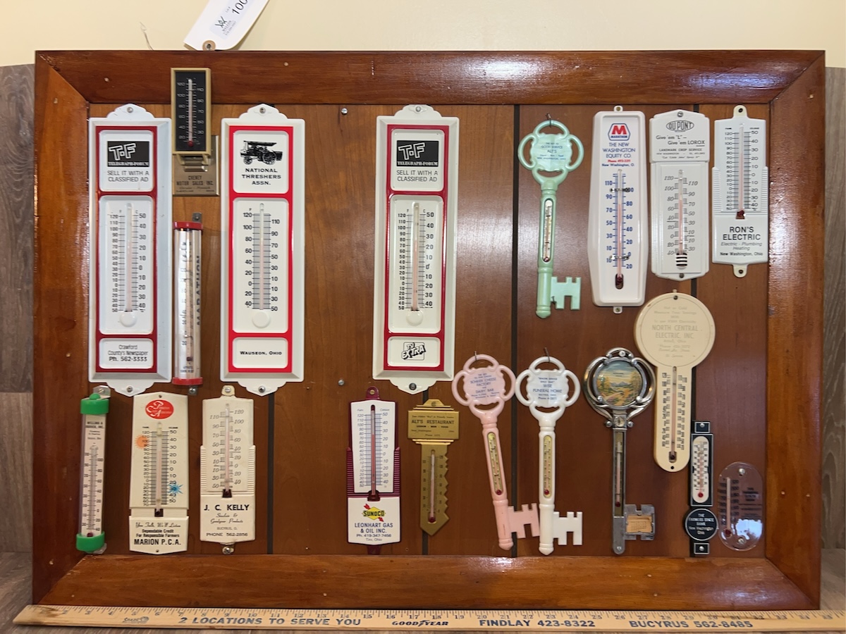Memorabilia Lots: Local & State Advertising Memorabilia- Bullet Pencils, Yardsticks, Advertising Pins, Rain Gauges, Thermometers, Hats, Pencils, Screw Drivers, Tape Measures, Matchboxes, Pocket Ledgers, Pens, Keychains, Fans, Buttons, Jars, Bottles, collector spoons & more.